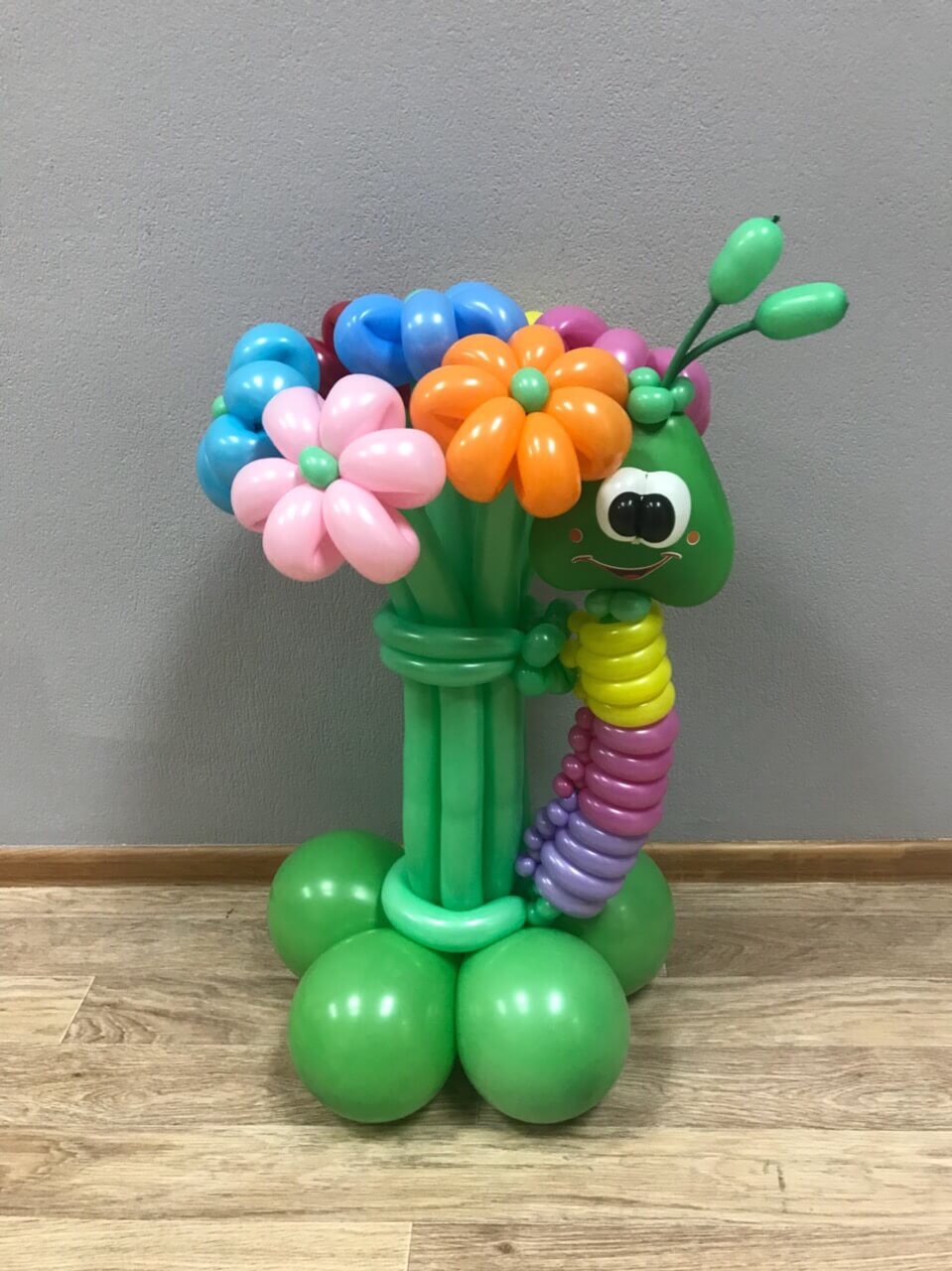 Букет ромашек и гусеница из воздушных шаров на подставке.