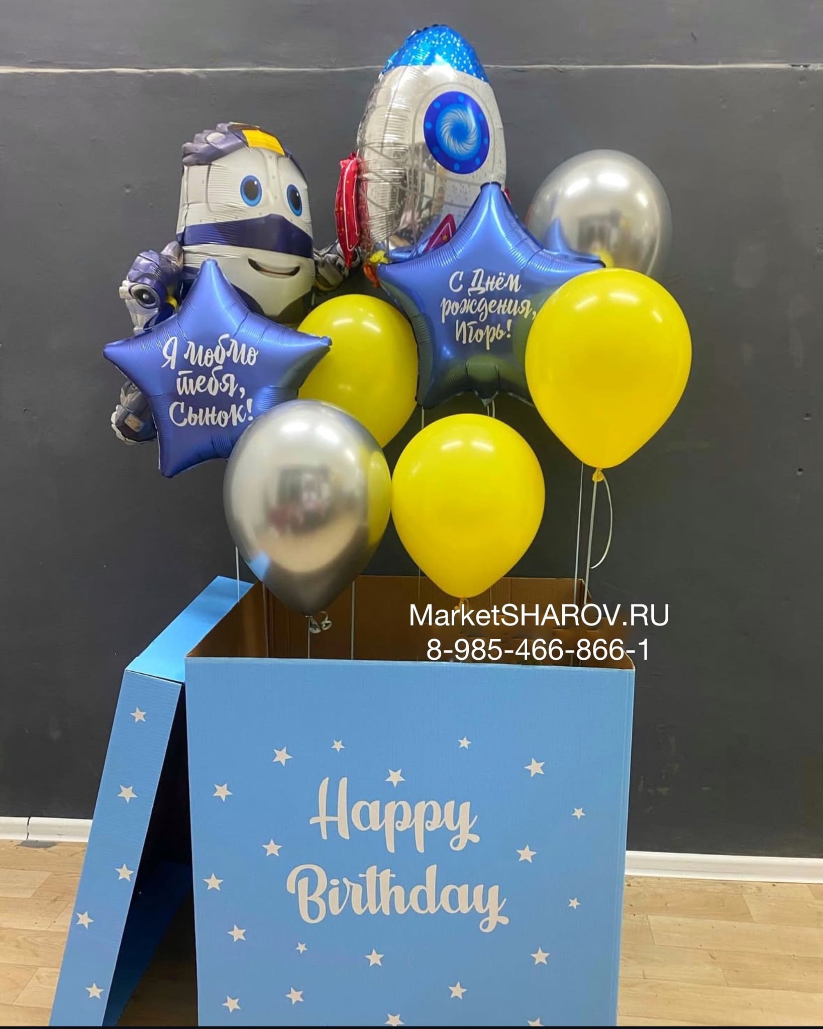 - Большая голубая коробка для шаров с надписью и большим бантом - 1 шт