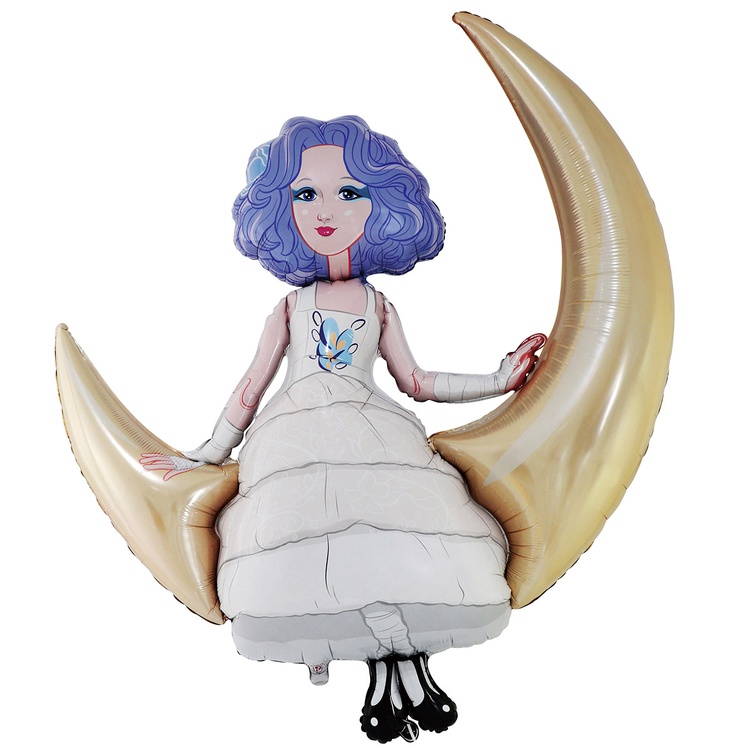Фольгированный фигурный шар Мальвина на полумесяце из мультфильма Буратино. Шар надут гелием, на ленте.