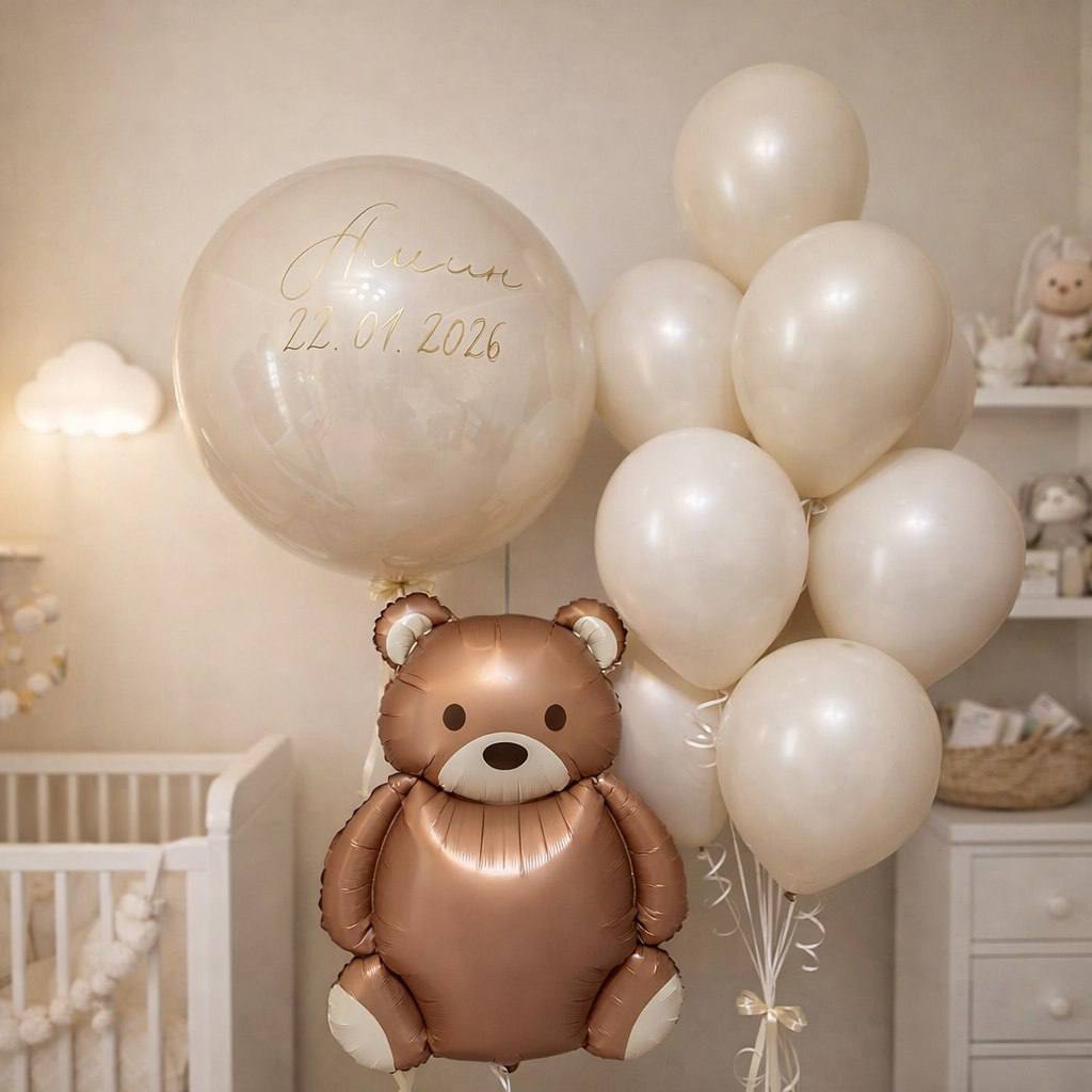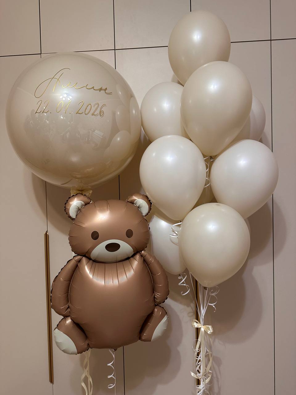 В комментарии к заказу укажите необходимый текст надписи, метрики на большой шар.