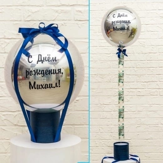 Композиция в коробке с воздушным шаром и лентой для денег.