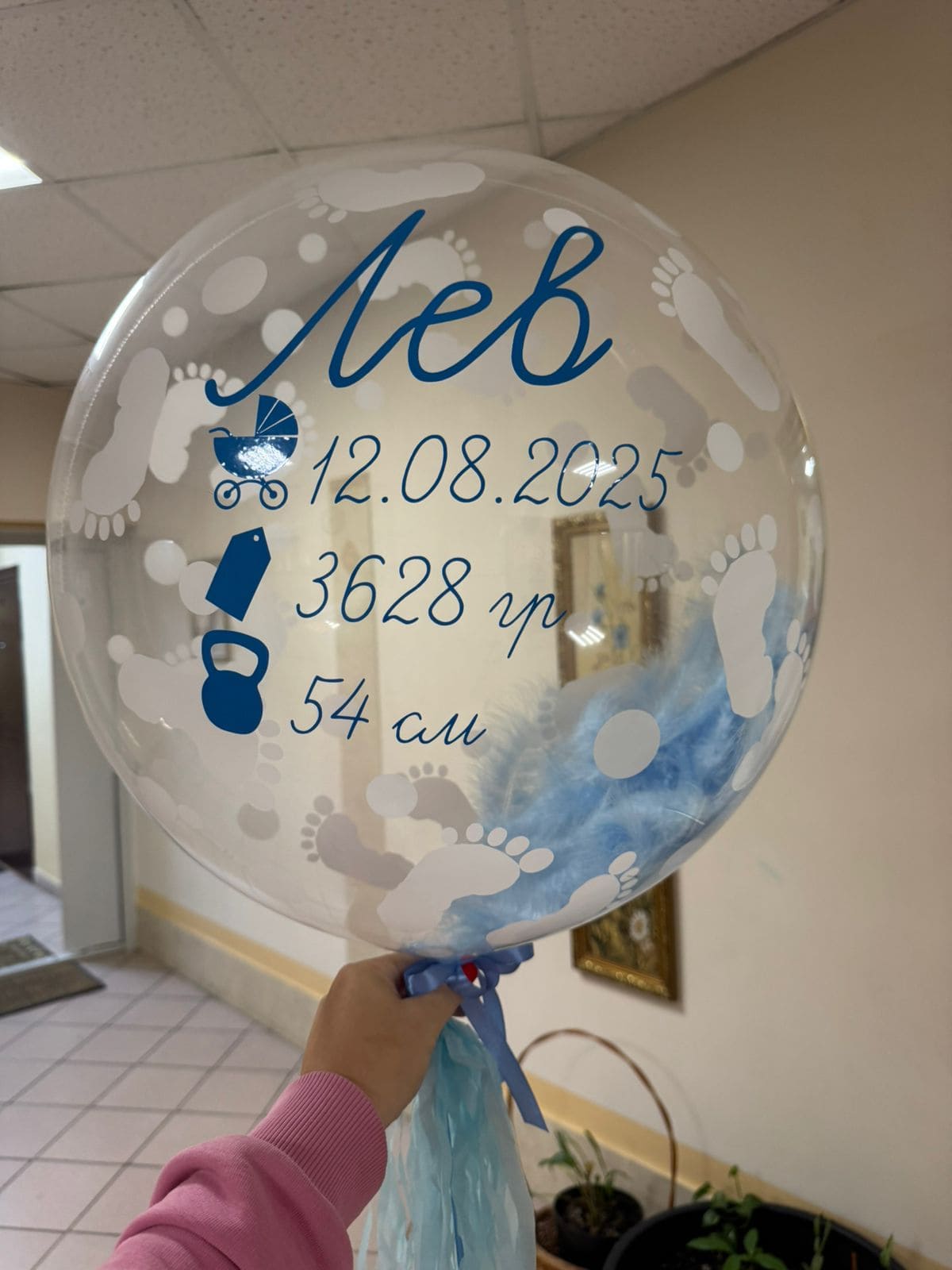 Прозрачный воздушный шар баблс с перьями, именем, датой рождения и другими метриками малыша.
