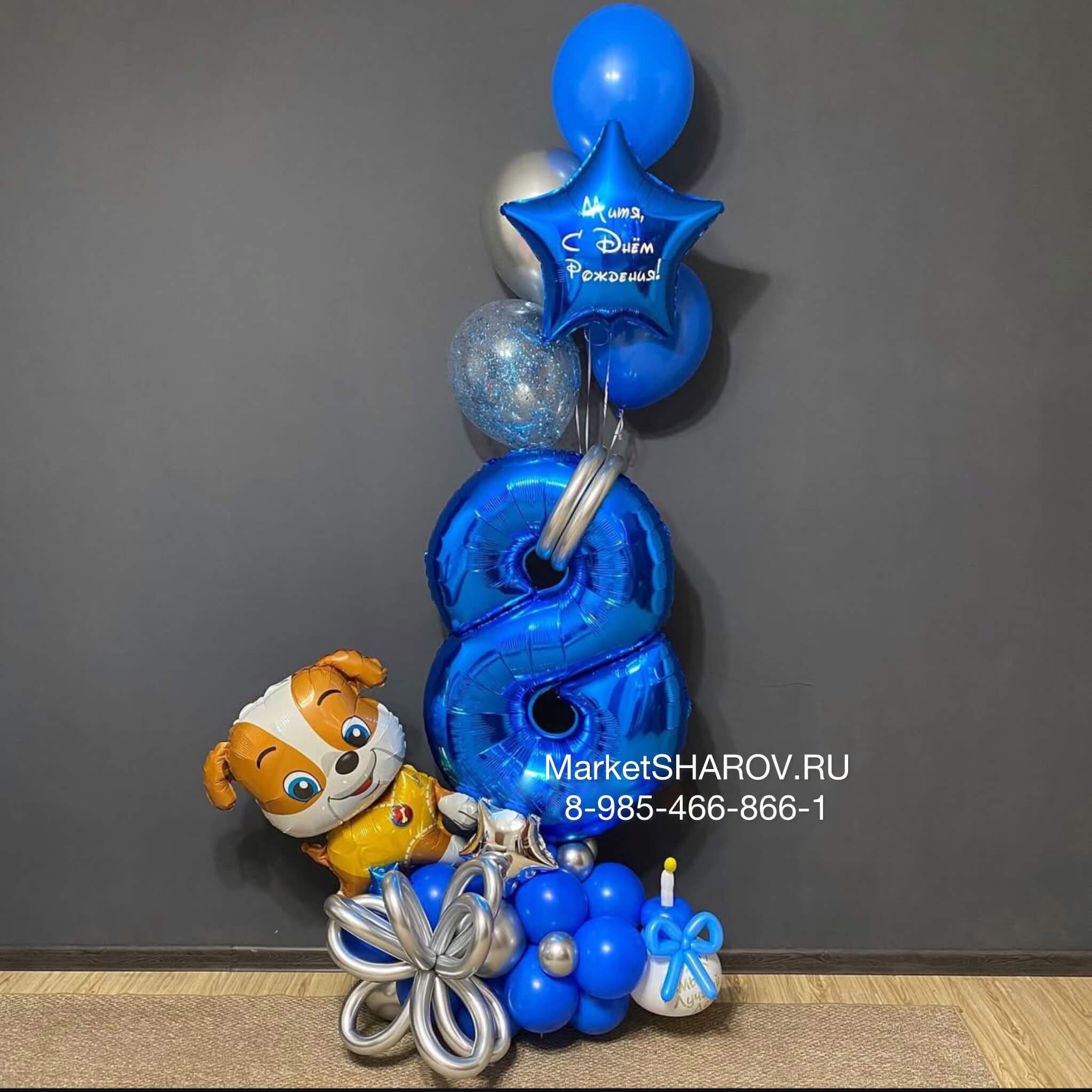 Композиция с синей цифрой и щенком из шаров. В комментарии к заказу укажите необходимую цифру и текст надписи.
