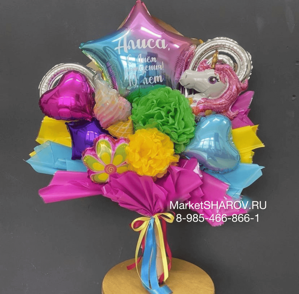 Большой букет с Кошкой-единорогом из маленьких фольгированных шаров для девочки. Шары надуты воздухом.