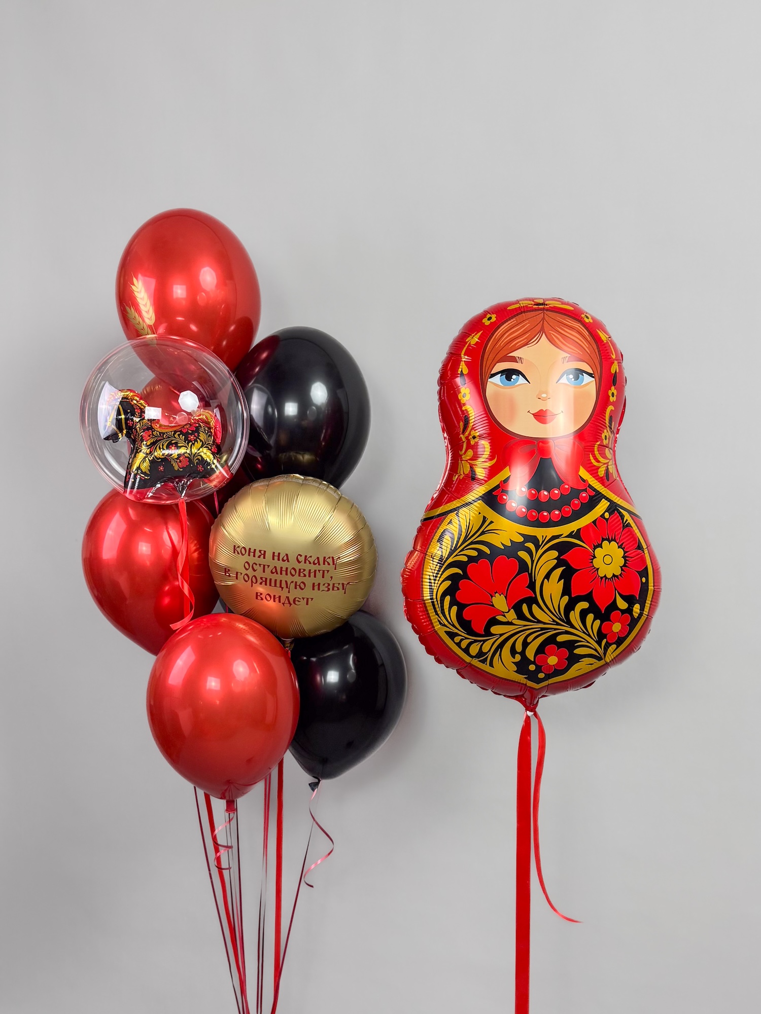 Набор воздушных шаров с Матрешкой и лошадкой с золотой росписью в русском стиле.